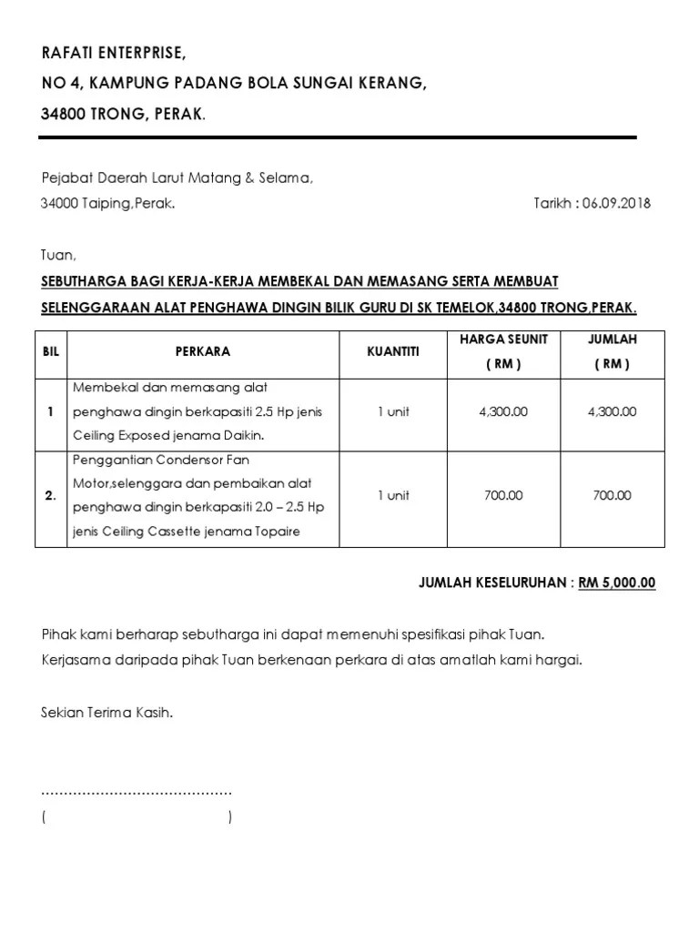 Contoh quotation harga makanan, contoh quotation harga, contoh quotation. Contoh format surat jemputan sebut harga . Contoh quotation harga makanan contoh quotation harga barang contoh quotation sebut harga contoh surat quotation harga contoh quotation . Format surat rasmi sebut harga. Quotation document shall only be issued to the tenderer upon the payment in the form of bank draft / money.